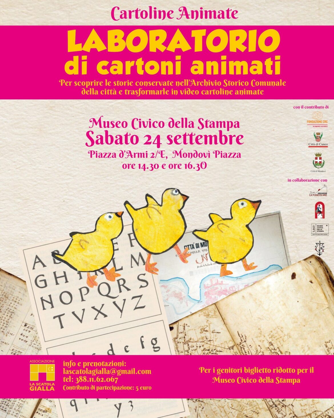 Il laboratorio è organizzato dall’associazione La scatola gialla che da anni cura laboratori di film d’animazione in musei, archivi e scuole del Piemonte in collaborazione con il Museo Casa Galimberti di Cuneo, l’Archivio Storico Comunale e il Museo Civico della Stampa di Mondovì, grazie al contributo di Fondazione CRC. L’obiettivo dell’iniziata è quello di avvicinare i ragazzi alla conoscenza degli archivi, a torto spesso ritenuti meri contenitori di documenti polverosi. Attraverso il laboratorio, scopriranno invece come in quei documenti sono conservate una infinità di storie da raccontare.