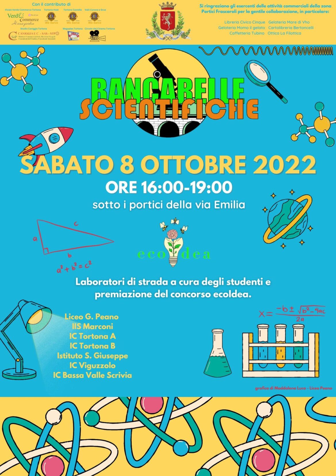 Un piccolo riconoscimento andrà anche, come tutti gli anni, alle autrici della grafica per il concorso ecoIdea e per la locandina delle Bancarelle: Maddalena Luca, Cecilia Timalo, Martina Romani, del Liceo Peano.