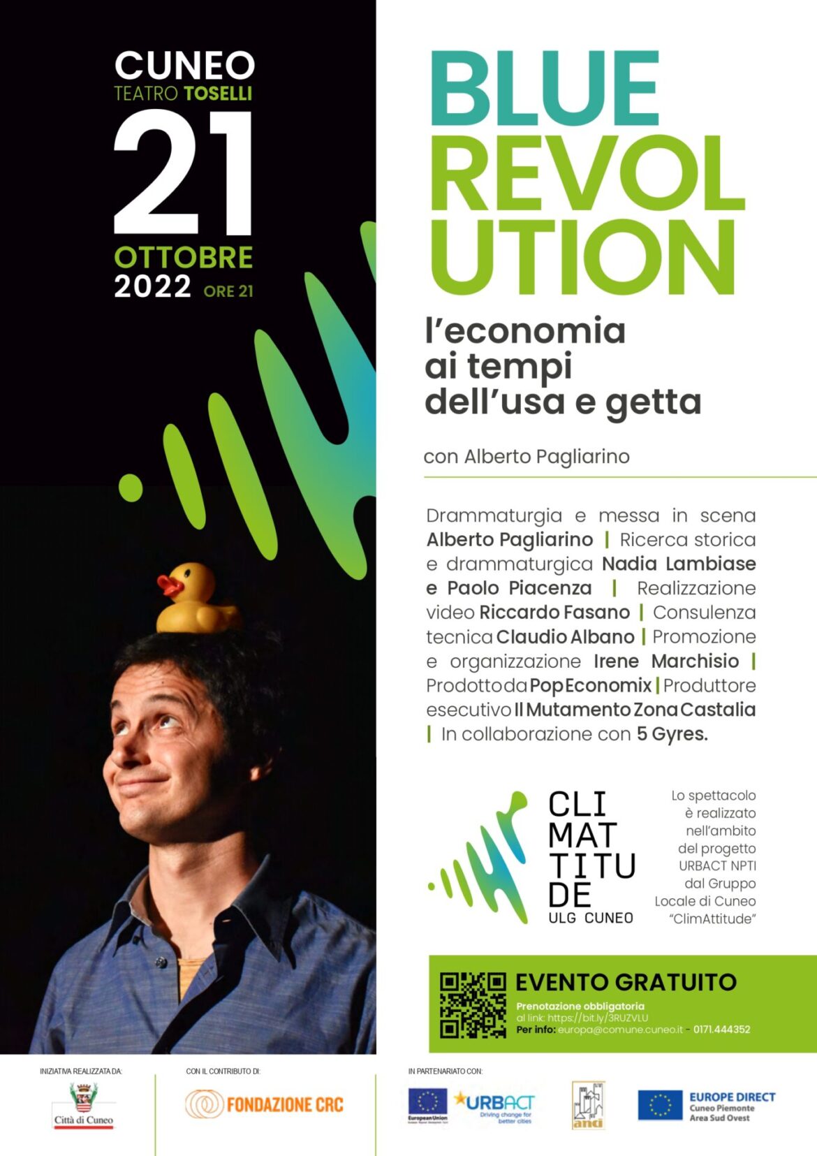 Venerdì 21 ottobre alle ore 21:00 al Teatro Toselli di Cuneo andrà in scena lo spettacolo “Blue Revolution – L’economia ai tempi dell’usa e getta” dell’Associazione Pop Economix.