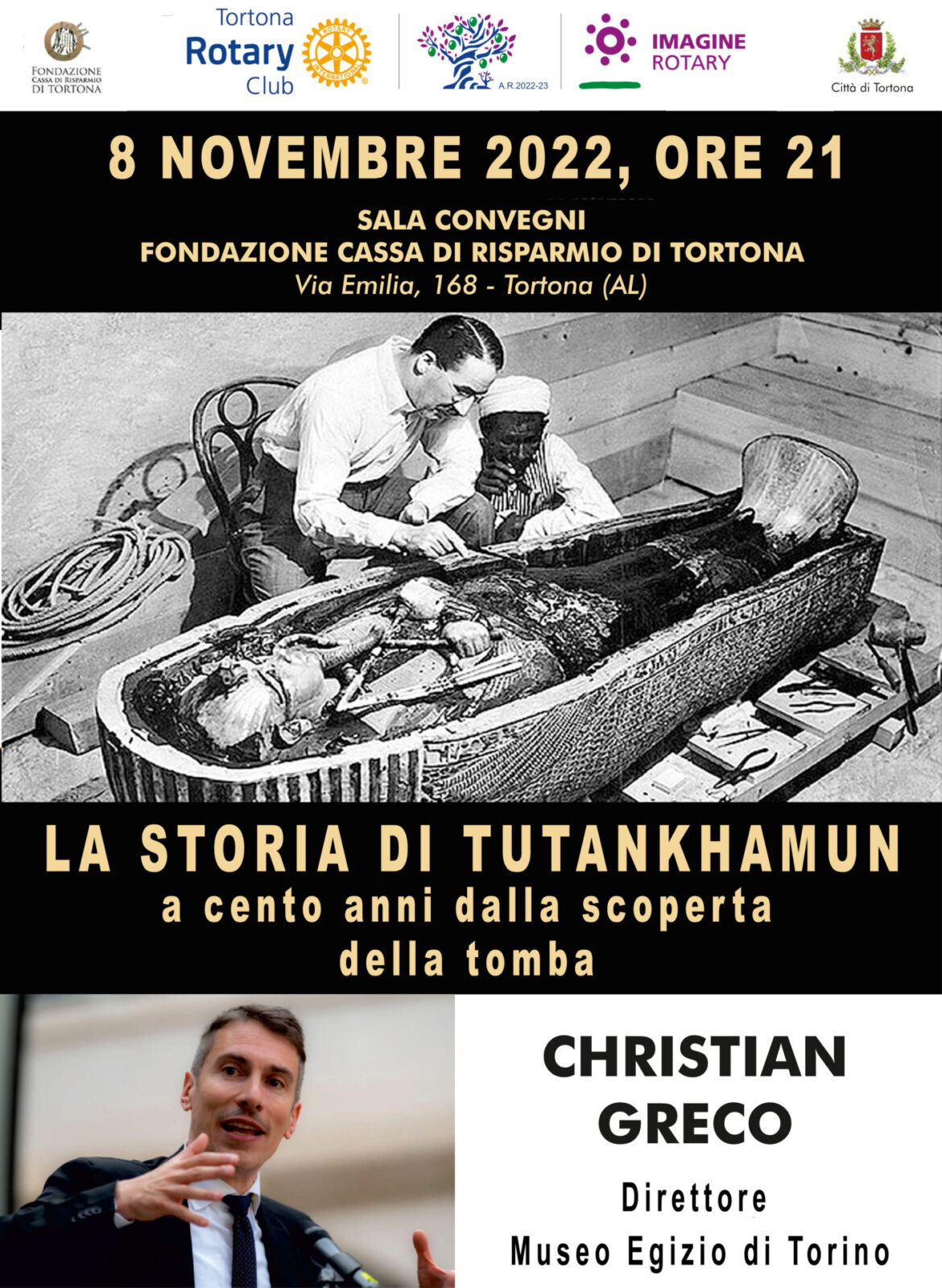 Martedì 8 novembre alle ore 21, presso la sala convegni della Fondazione Cassa di Risparmio di Tortona in via Emilia 168, il Rotary Club Tortona organizza la seconda relazione aperta alla cittadinanza di una serie di incontri con illustri personaggi del mondo della ricerca e dell’innovazione, della cultura e della divulgazione scientifica. L’ospite sarà il direttore del Museo Egizio di Torino, dottor Christian Greco, che parlerà del tema “La storia di Tutankhamun a 100 anni dalla scoperta della tomba”.