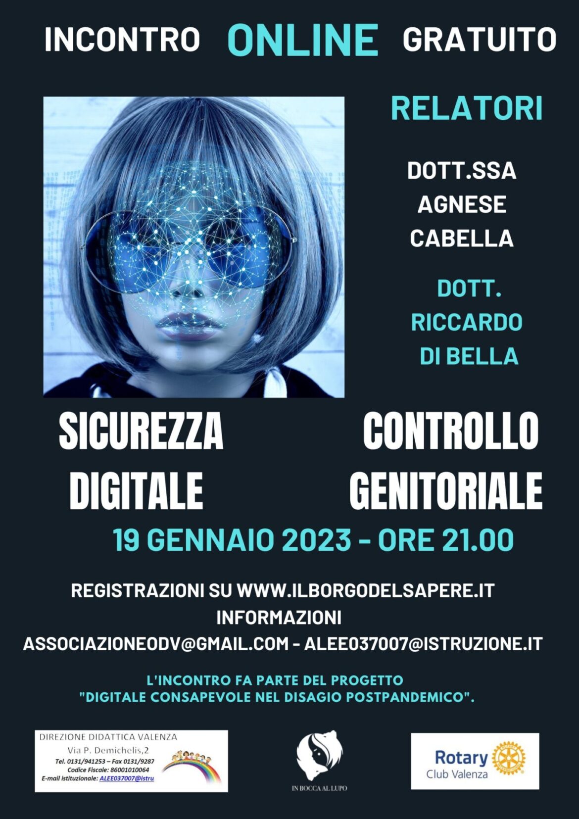 Giovedì, alle ore 21, nell’ambito di un’iniziativa che coinvolge l’associazione In bocca al lupo, la Direzione Didattica di Valenza e il Rotary Club Valenza si tiene un interessante incontro ONLINE gratuito, sulla sicurezza digitale e il controllo genitoriale, temi di assoluta importanza per via delle insidie che la rete nasconde.
