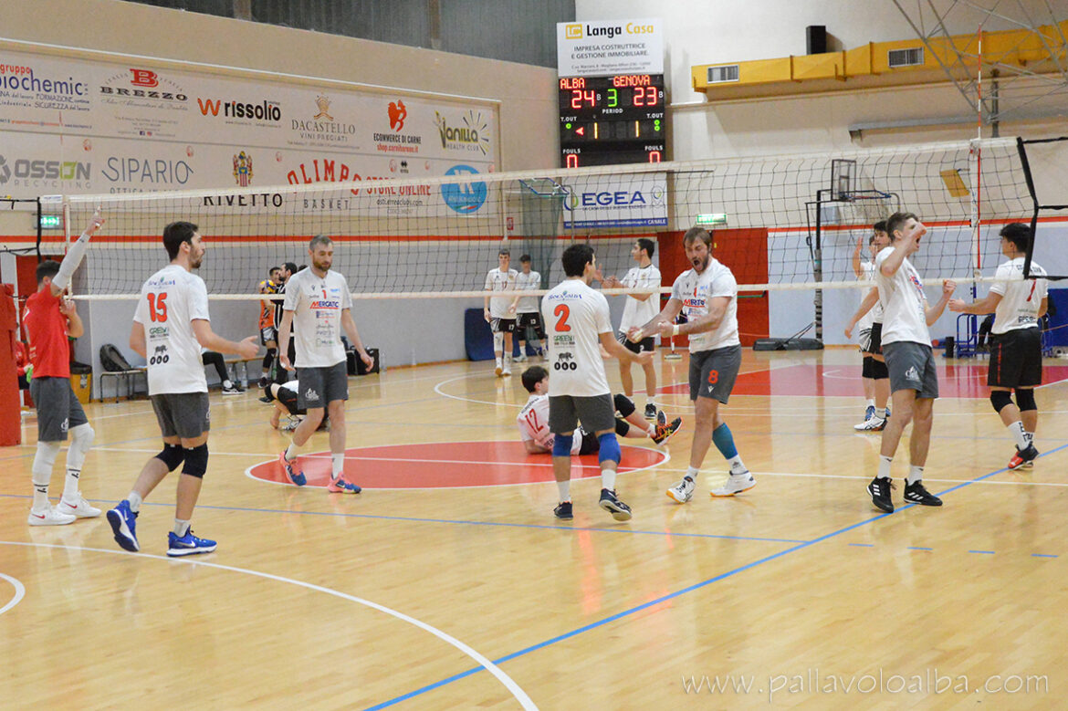 Dopo 3 sconfitte consecutive la Mercatò Alba ritorna al successo, e lo fa centrando i 3 punti, grazie al 3-1 ottenuto al PalaLanghe contro la giovane formazione della Colombo Volley Genova.