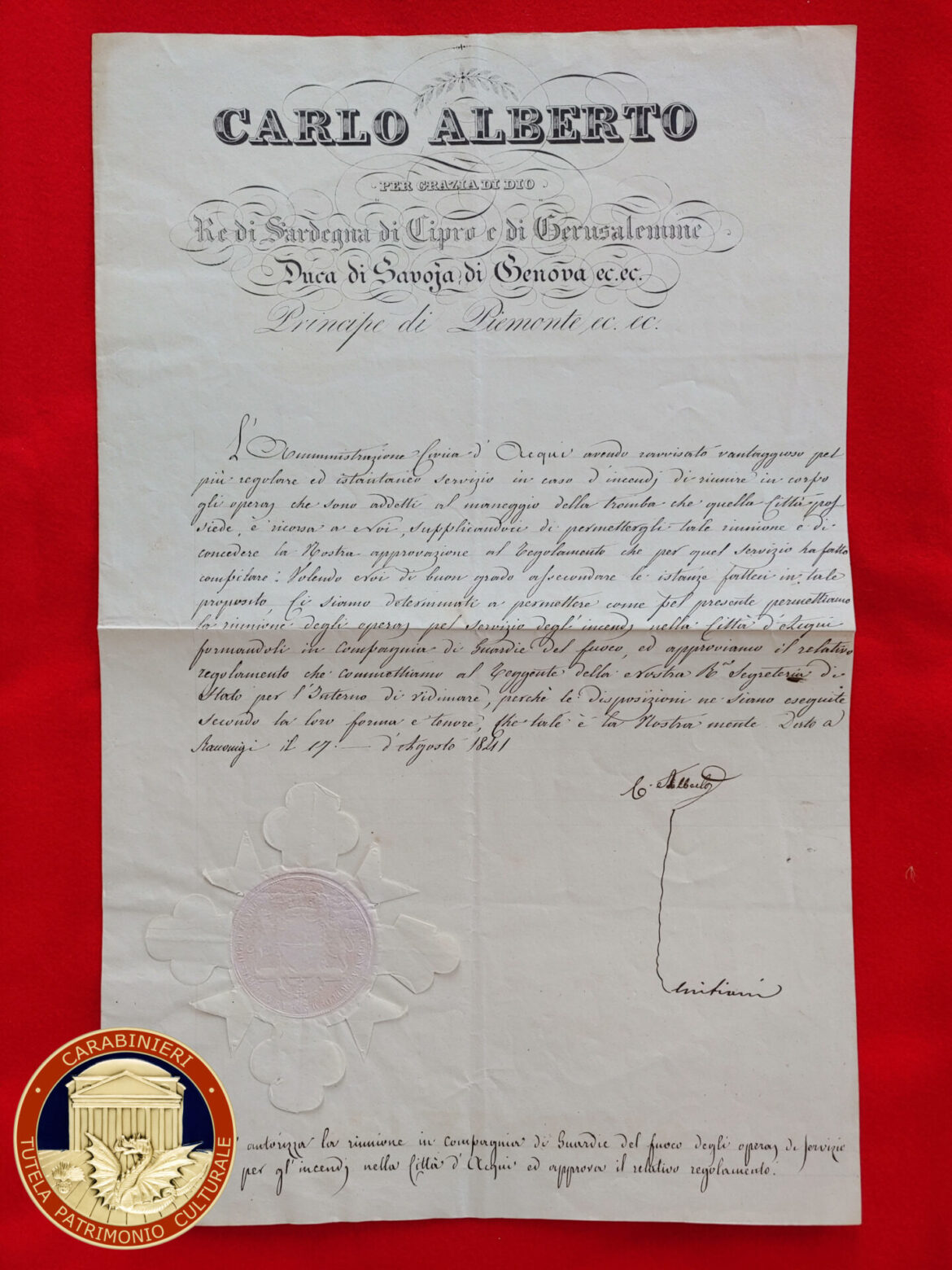 Comandante del Nucleo Carabinieri Tutela Patrimonio Culturale e del Sindaco di Acqui Terme, avverrà la formale riconsegna del documento di natura pubblica per la ricollocazione al suo fondo originario.