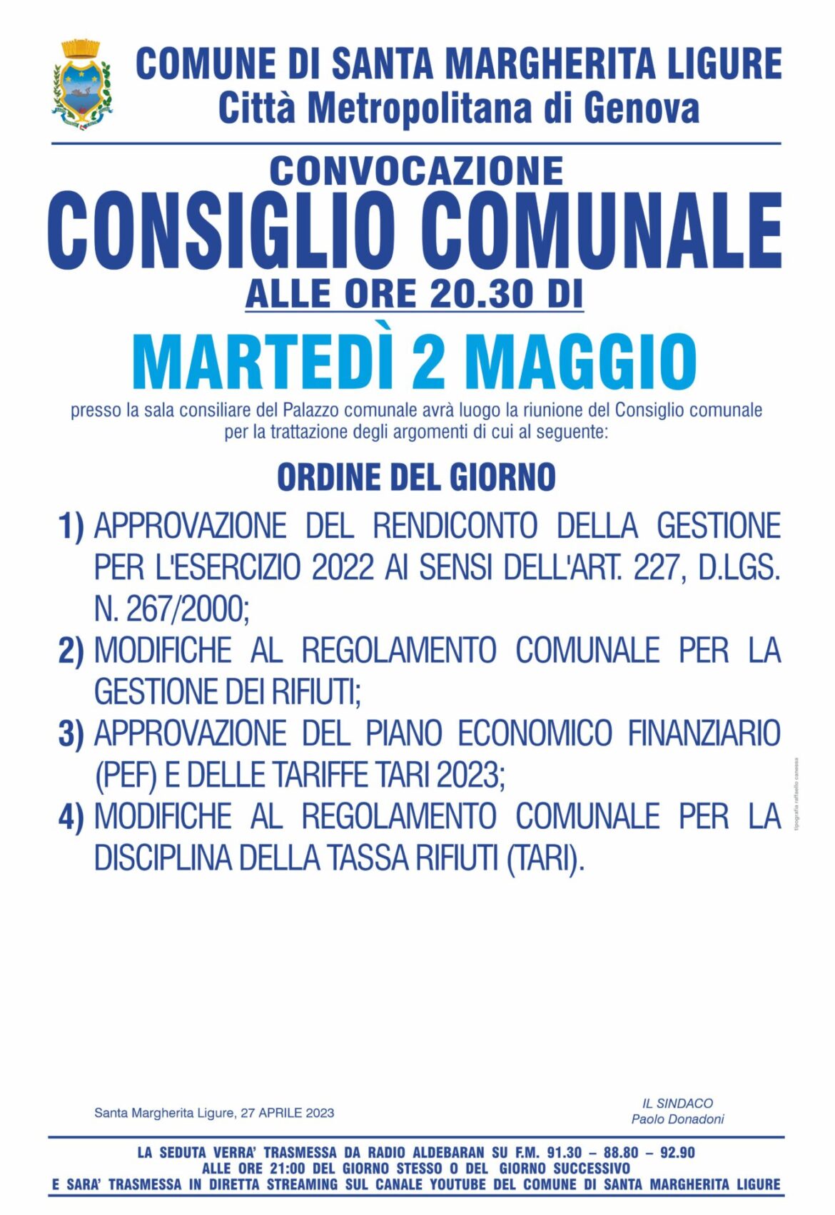 Il sindaco Paolo Donadoni ha convocato per martedì 2 maggio, alle 20.30 il consiglio comunale.