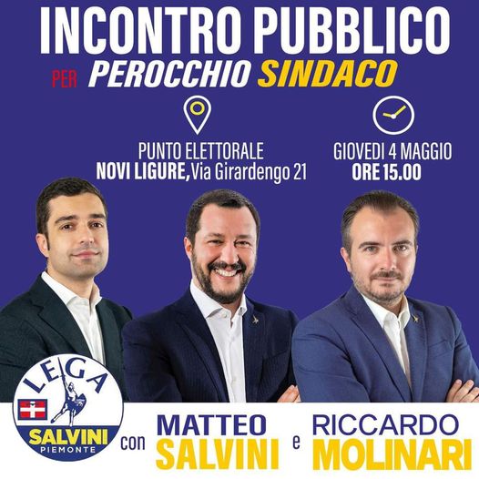 Il Segretario Federale della Lega Matteo Salvini, Ministro delle Infrastrutture e dei Trasporti, sarà a Novi Ligure giovedì 4 maggio, per sostenere il candidato sindaco Giacomo Perocchio, a capo di una coalizione composta dalla Lega e da tre liste civiche.