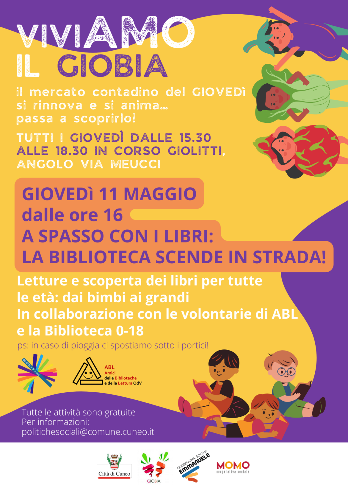 Giovedì 11 maggio 2023, in continuità con le iniziative di “Viviamo il Giobia”, dalle ore 16 l’angolo tra Corso Giolitti e Via Meucci a Cuneo verrà animato da “Libri per tutti: la biblioteca scende in strada”. Bambini, ragazzi e adulti, liberamente potranno consultare e sfogliare alcuni libri messi a disposizione delle biblioteche cittadine: dai fumetti, ai romanzi, ai silenti book e molto altro. All’iniziativa saranno presenti le volontarie di ABL che consiglieranno le letture e leggeranno ad alta voce per chi vorrà, sia grandi che piccini. L’iniziativa nasce dalla collaborazione con La Biblioteca 0/18 del Comune di Cuneo e l’ODV Amici delle Biblioteche e della Lettura, nell’ottica di promuovere la lettura per tutti, in spazi insoliti e fuori dal comune. L’attività si terrà comunque anche in caso di pioggia, sfruttando l’area coperta dei portici.