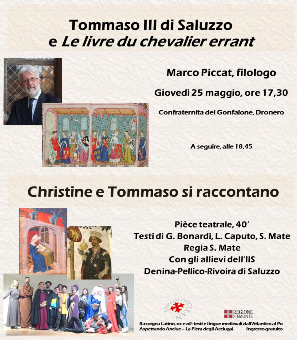 Giovedì 25 maggio, alla Confraternita del Gonfalone di Dronero, con un doppio appuntamento: alle ore 17.30 Marco Piccat, già professore ordinario di Filologia Romanza all’Università di Trieste, parlerà di Tommaso III di Saluzzo e Le livre du chevalier errant, per cui ha curato l’edizione critica edita nel 2008.
