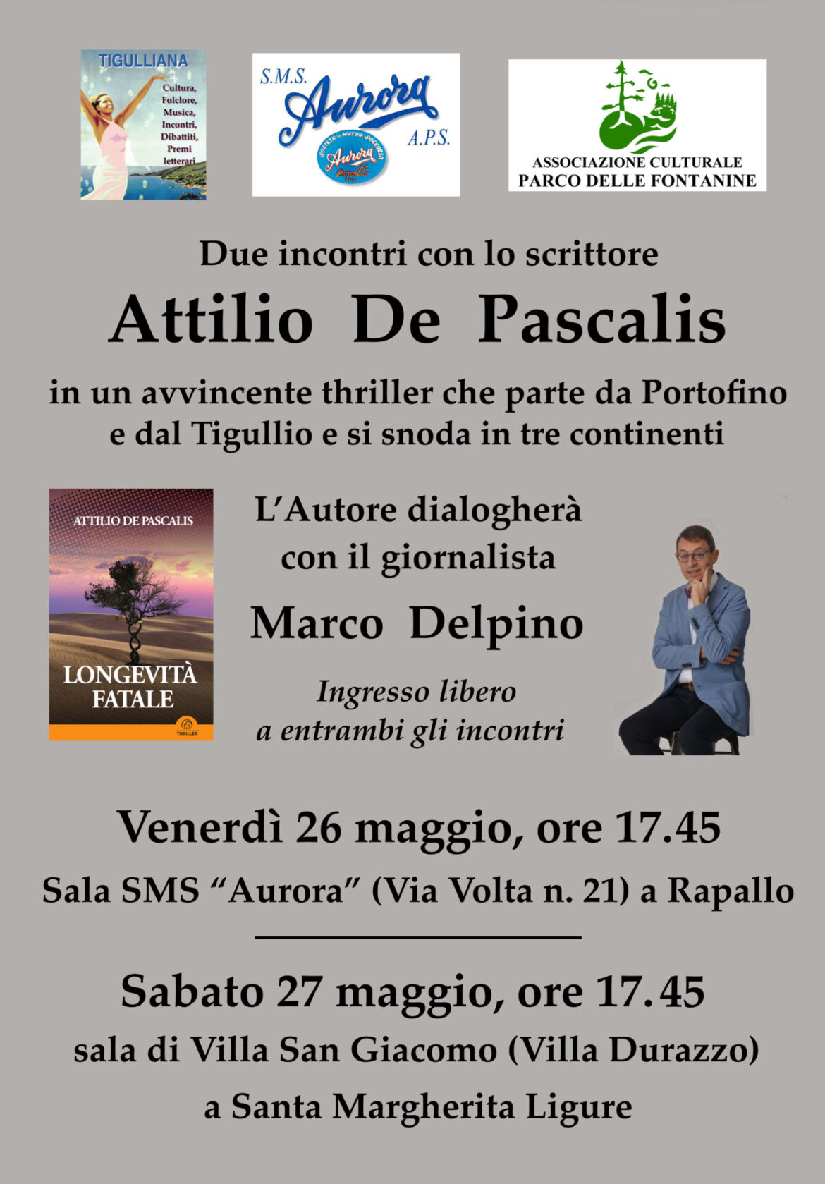 In entrambi i casi sarà Marco Delpino, direttore della “Tigulliana” a presentare il libro insieme con l’autore. A Rapallo interverrà anche la Prof.ssa Mariabianca Barberis (presidente dell’associazione “Parco delle Fontanine”).