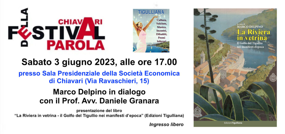 Si svolgerà sabato 3 giugno, a Chiavari, nell’ambito del “Festival della parola”, alle ore 17, presso la sala presidenziale della Società Economica (Via Ravaschieri n. 15), la presentazione del libro “La Riviera in vetrina – il Golfo del Tigullio nei manifesti d’epoca” (edito dalla “Tigulliana”).