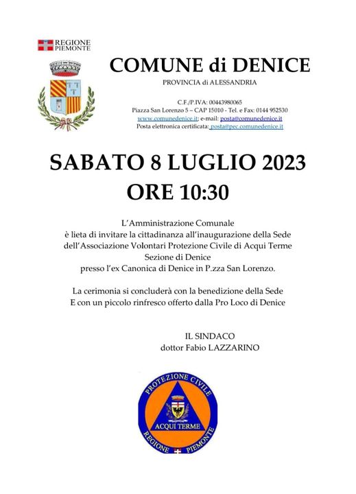 Sabato 8 luglio, alle ore 10.30, si terrà l’inaugurazione della sede della Associazione volontari protezione civile di Acqui Terme – Sezione di Denice nei locali della ex canonica di piazza San Lorenzo.