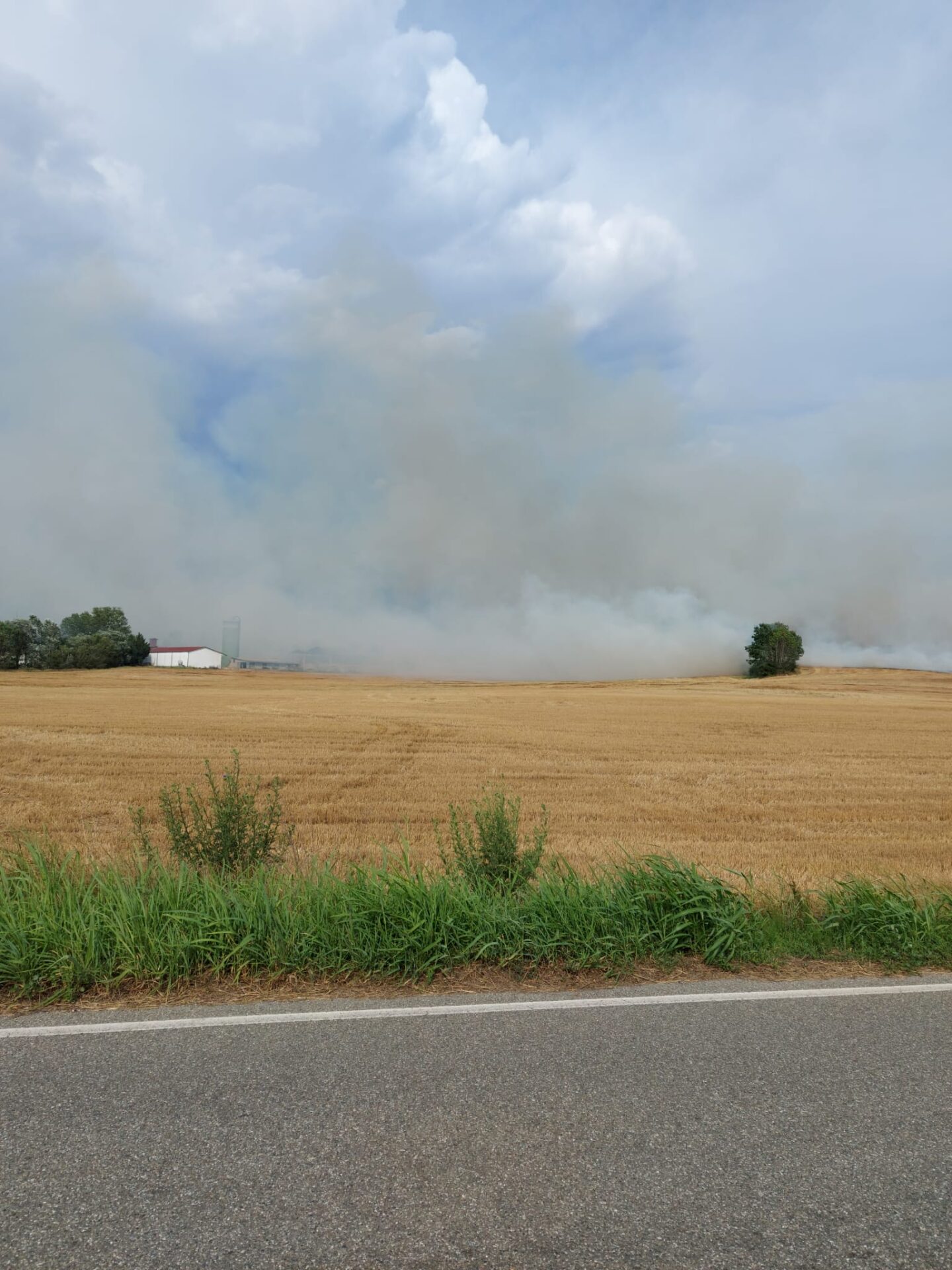Quattro autobotti dei vigili del fuoco sono al lavoro tra Quattordio e Masio per spegnere un incendio che si è sviluppato nelle vicinanze della ferrovia e della strada provinciale (foto Rdv Melis)