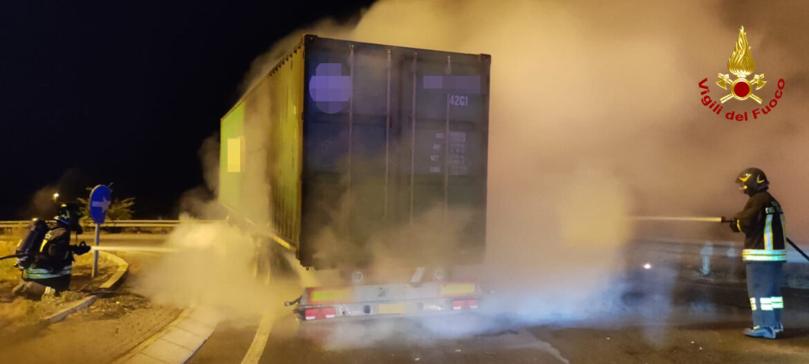L’incendio causato da un probabile surriscaldamento dei freni del semirimorchio si è propagato al carico rendendo necessario l’invio anche dell’autobotte per il rifornimento idrico.