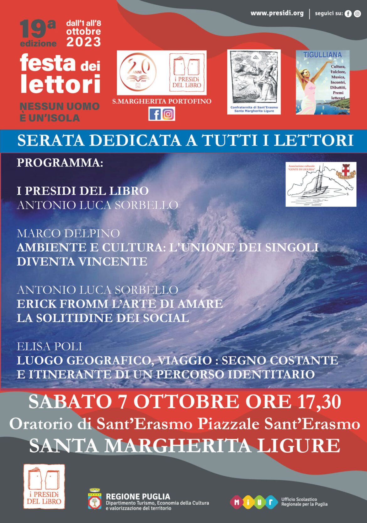 In occasione della 19ª edizione della “Festa nazionale dei Lettori”, il “Presidio del Libro” di Santa Margherita Ligure e Portofino, in collaborazione con l’associazione “Tigulliana”, organizza un incontro-convegno intitolato “Nessun uomo è un’isola”, che si svolgerà nel pomeriggio di sabato 7 ottobre, a partire dalle ore 17.30, presso l’Oratorio di Sant’Erasmo a Santa Margherita Ligure.