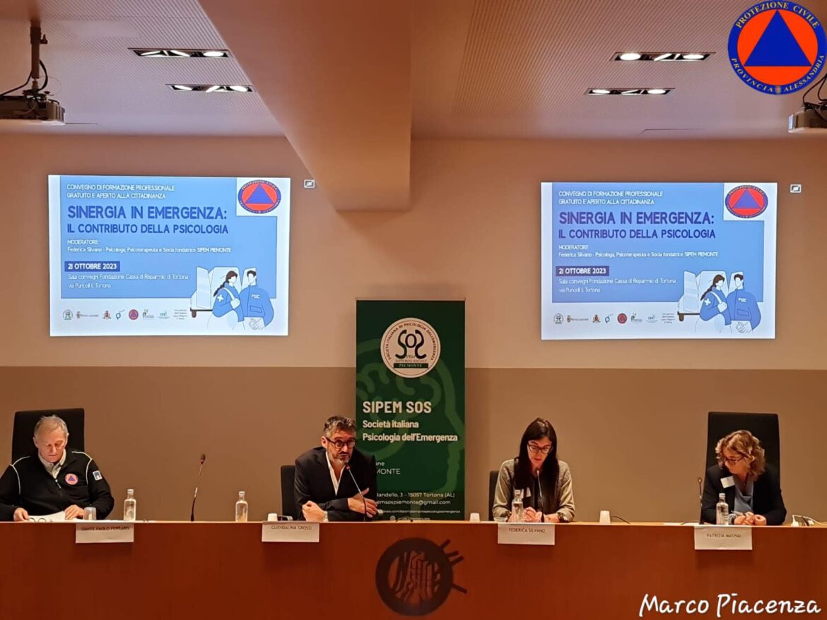Sabato 21 ottobre nella sala convegni della fondazione Cassa di Risparmio di Tortona ha avuto luogo il seminario Sinergie in emergenza: il contributi della psicologia, organizzato dalla SIPEMSos del Piemonte ( Societa Italiana di psicologia di Emergenza) presieduta da Patrizia Masino. Dopo il saluto ai numerosi convenuti, tra professionisti e volontari di Associazioni sanitarie e di protezione civile, portato dal Sindaco di Tortona, Federico Chiodi, sono iniziate le relazioni. Saluto anche portato da Lorenzo Torielli, presidente del Comitato di coordinamento delle organizzazioni di volontariato di protezione civile CSVAA ( Centro servizi del volontariato di Alessandria e Asti). Federica Silvano psicologa e psicoterapeuta ha moderato gli interventi che si sono succeduti. Le relazioni, tutte interessanti , hanno trattato il ruolo della psicologia nel sistema di protezione civile, ridurre lo stress in emergenza e creare resilienza: il contributo della mindfulness, fare rete come strategia trasversale, l’intervento del soccorritore in emergenza: esperienze e buone pratiche, psicologia dell’emergenza ed EMDR. Al tavolo dei relatori, gli psicologi Elena Verni, Fabrizio Tabiani, Nicoletta Vesce, Gianluca Marocco, Guendalina Grossi e il Disaster manager della Protezione civile della Provincia Dante Paolo Ferraris.