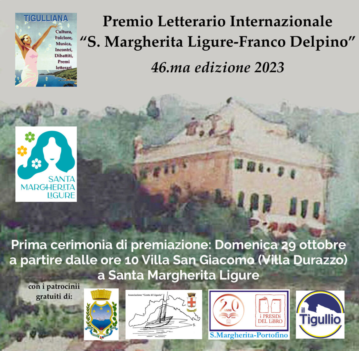 L’evento, promosso dall’associazione culturale “Tigulliana” e dal periodico “Bacherontius”, gode del patrocinio gratuito del Comune di Santa Margherita Ligure e dell’associazione “Gente di Liguria”, del “Presidio del Libro S. Margherita Ligure-Portofino” e del Gruppo “Il Tigullio”.