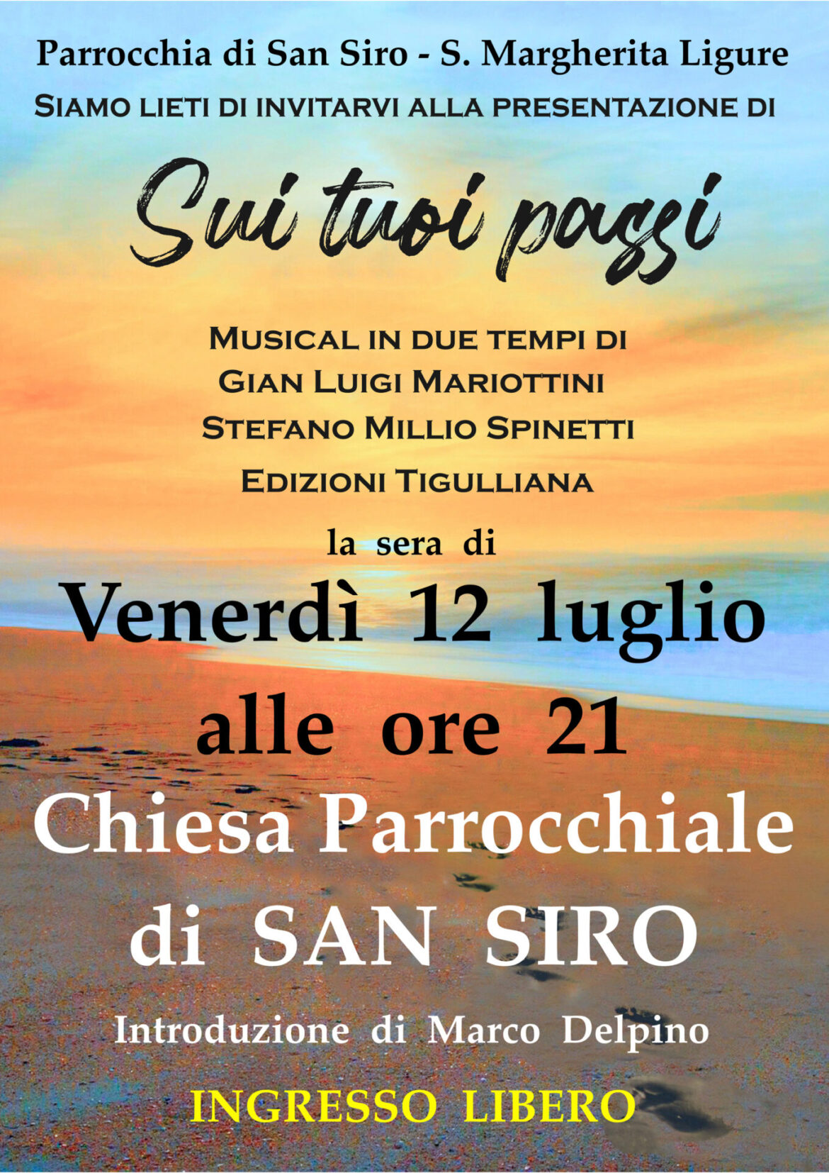 Si svolgerà la sera di venerdì 12 luglio, a partire dalle ore 21, nella Chiesa Parrocchiale di San Siro a Santa Margherita Ligure, la presentazione del libro e del cd musicale “Sui tuoi passi” (edito dalla “Tigulliana”).