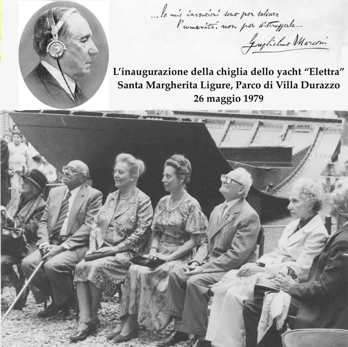 Nella foto (archivio “Tigulliana”) – 26 maggio 1979: la cerimonia di collocazione della chiglia della nave “Elettra” a Villa Durazzo, alla presenza della vedova di Guglielmo Marconi, la Contessa Maria Cristina Bezzi-Scali, e della figlia del grande scienziato.