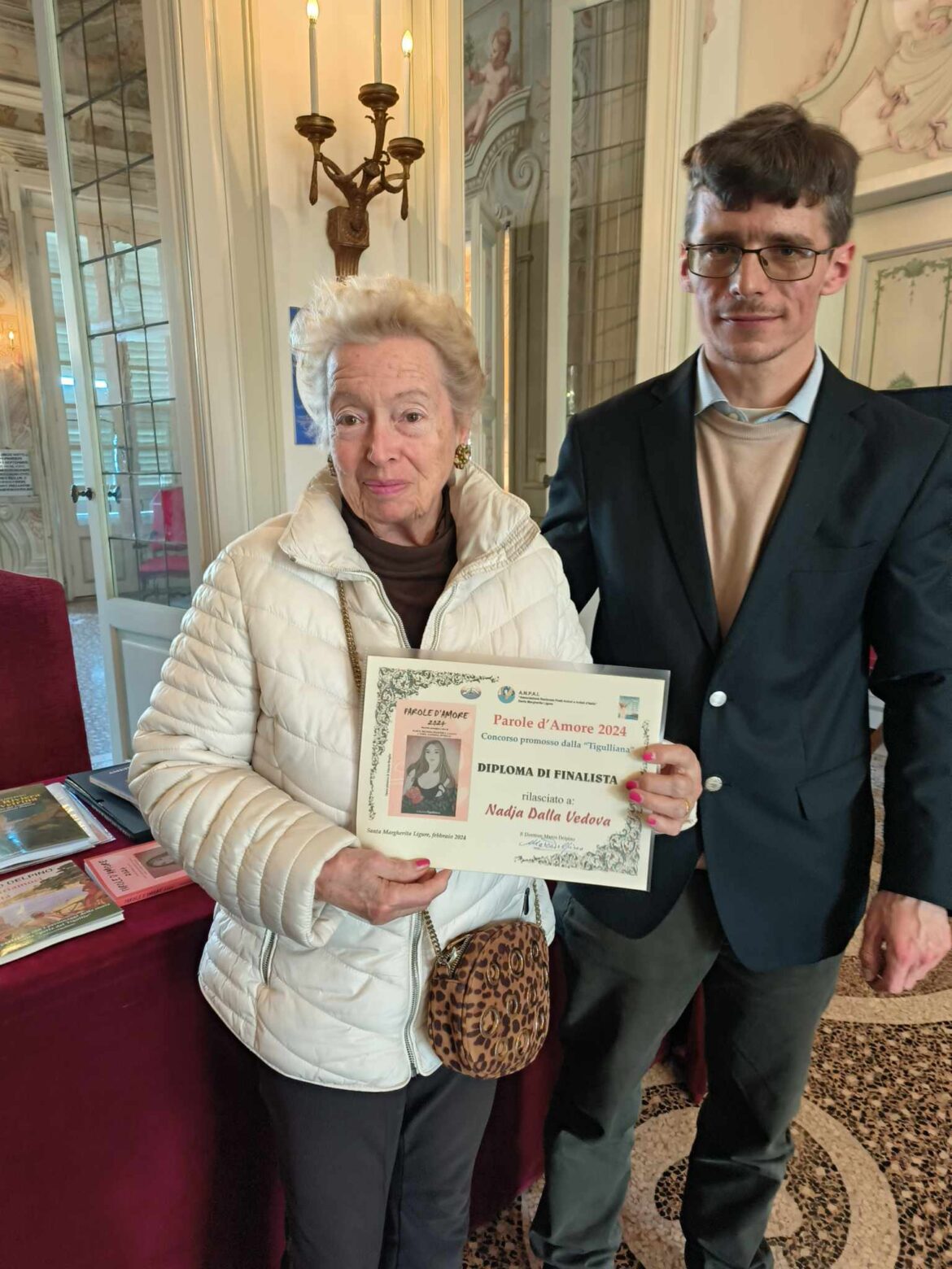 Nella foto: Nadja Dalla Vedova mentre riceve il Premio da Giuliano Beaud (Associazione Internazionale “Amici del Monte di Portofino”) a Villa Durazzo di Santa Margherita Ligure.