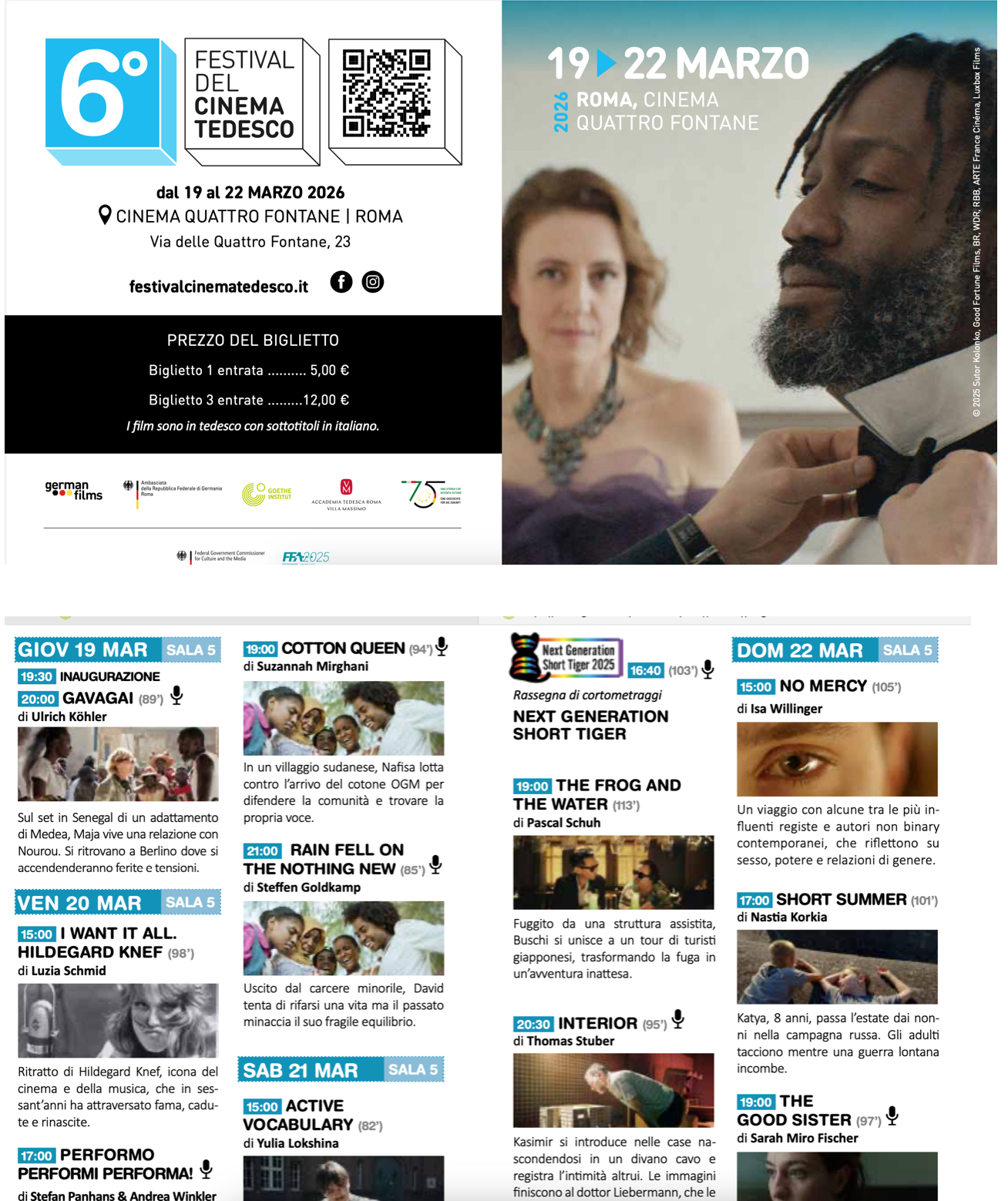 Dal 19 al 22 marzo 2026 si terrà la 6° Rassegna del Cinema Tedesco a Roma. Un appuntamento che porta nella Capitale un’esclusiva selezione del meglio della cinematografia tedesca contemporanea. I lungometraggi, documentari e cortometraggi saranno proiettati in lingua originale con sottotitoli in italiano. Sarà possibile dialogare dal vivo con numerosi ospiti internazionali.